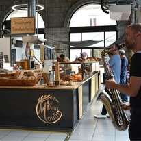 Étal fixe à la Halle gourmande de St-Gaudens avec comptoir à sandwichs.