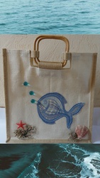 Sac en toile de "jute " décoré d'une fleur en dentelle et de quelques accessoires ,comme un papillon et des pétales .