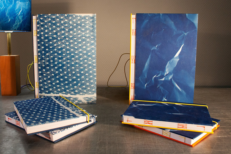 Abat-jour papier avec tirage cyanotype original, monté sur polyphane. Ajout d'éléments graphique doré à chaud sur l'image. Prix sans le pied, ici pied brocante à 35€ ...