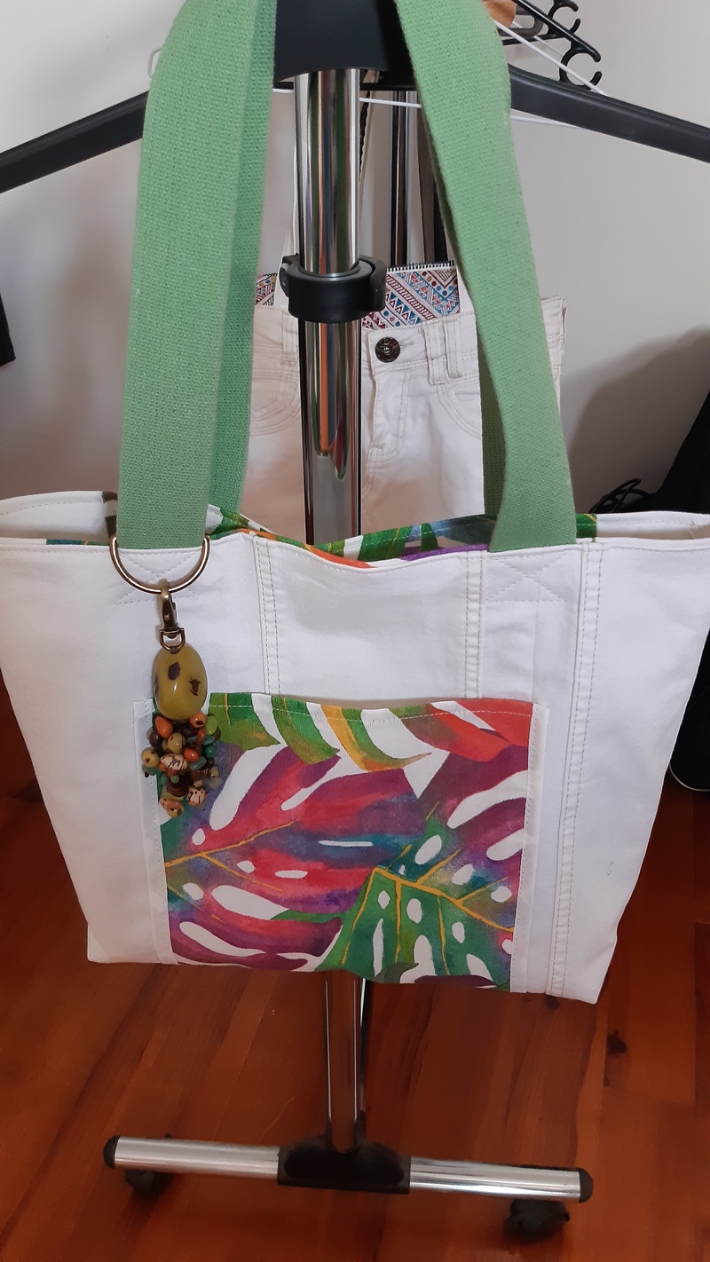 Toujours dans le recyclage de jean, voici un modèle très estival, de couleur beige, et doublé rayures beige et bleu, ce joli à dos vous séduira pour sa forme  et sa contenance ...
